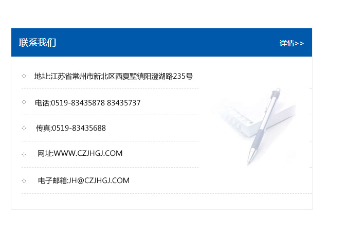 地址:常州市新北區友邦商務大廈1幢16、17層  電話:0519-85101652  傳真:0519-85112595  郵編:213022  網址:www_cz-jiayue_cn.whtsrg.com  郵箱:xiajifengaa@163.com